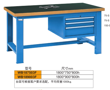 工作臺WB187503介紹: 工作臺采用優(yōu)質(zhì)冷扎板精工制作而成,堅(jiān)固的工作桌框架,牢固平穩(wěn),可使工作桌承重1000kg;多種工作桌面選擇,可配合不工使用的要求; 該工作臺配置了50厚高分子復(fù)合臺面,櫸木包邊,美觀,堅(jiān)固,適用于檢測,維修等;工作臺右側(cè)配2*75,1*150三抽吊柜,抽屜可配分格,有利于現(xiàn)場物料的整理,規(guī)劃。