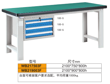 工作臺介紹WB217503: 工作臺采用優(yōu)質冷扎板精工制作而成,堅固的工作桌框架,牢固平穩(wěn),可使工作桌承重1000kg;多種工作桌面選擇,可配合不工使用的要求; 工具吊柜(箱),側柜(箱)燈架,調節(jié)腳杯,外形美觀;層板,抽屜質量上乘,承重大,抽屜內可根據需要任意分隔;節(jié)約空間,適用性強