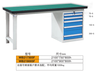 工作臺(tái)介紹WB217505: 工作臺(tái)采用優(yōu)質(zhì)冷扎板精工制作而成,堅(jiān)固的工作桌框架,牢固平穩(wěn),可使工作桌承重1000kg;多種工作桌面選擇,可配合不工使用的要求; 工具吊柜(箱),側(cè)柜(箱)燈架,調(diào)節(jié)腳杯,外形美觀;層板,抽屜質(zhì)量上乘,承重大,抽屜內(nèi)可根據(jù)需要任意分隔;節(jié)約空間,適用性強(qiáng)