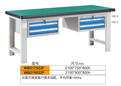 工作臺介紹WB217522: 工作臺采用優(yōu)質(zhì)冷扎板精工制作而成,堅固的工作桌框架,牢固平穩(wěn),可使工作桌承重1000kg;多種工作桌面選擇,可配合不工使用的要求; 工具吊柜(箱),側(cè)柜(箱)燈架,調(diào)節(jié)腳杯,外形美觀;層板,抽屜質(zhì)量上乘,承重大,抽屜內(nèi)可根據(jù)需要任意分隔;節(jié)約空間,適用性強(qiáng)
