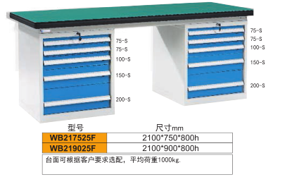 工作臺(tái)介紹WB217525: 工作臺(tái)采用優(yōu)質(zhì)冷扎板精工制作而成,堅(jiān)固的工作桌框架,牢固平穩(wěn),可使工作桌承重1000kg;多種工作桌面選擇,可配合不工使用的要求; 工具吊柜(箱),側(cè)柜(箱)燈架,調(diào)節(jié)腳杯,外形美觀;層板,抽屜質(zhì)量上乘,承重大,抽屜內(nèi)可根據(jù)需要任意分隔;節(jié)約空間,適用性強(qiáng)