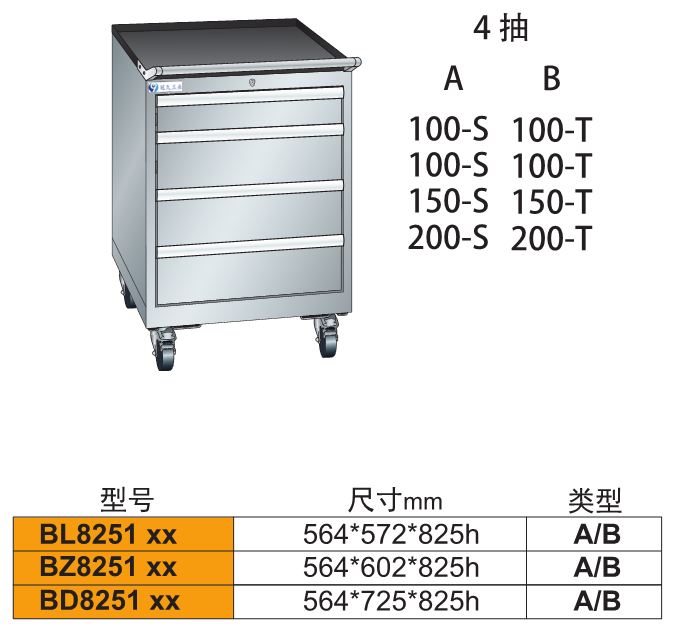 2、由各種型號的工具柜增加頂柜和腳輪等移動部件組成。