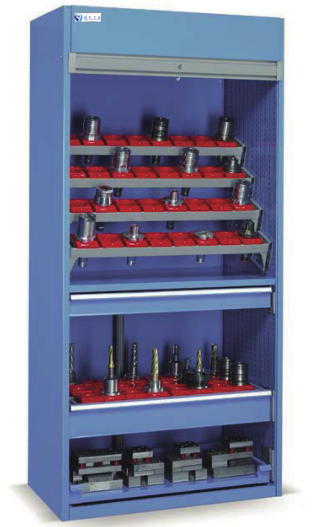 刀具柜,是專門用來存放各種車床上常用刀具的柜子。刀具柜的柜體一般采用冷軋鋼板制成,堅(jiān)固耐用。刀具柜內(nèi)常有3-5個(gè)橫檔可拉抽屜,抽屜內(nèi)有ABS材質(zhì)的刀具套,防滑防油,以便刀具自由組合式的存放。刀具柜一般都為雙門對開式,柜體裝有可調(diào)式腳墊,柜體可調(diào)整高度,柜子防滑防潮。刀具柜常用在工廠機(jī)加工中心,便于刀具的集中管理,取用方便。