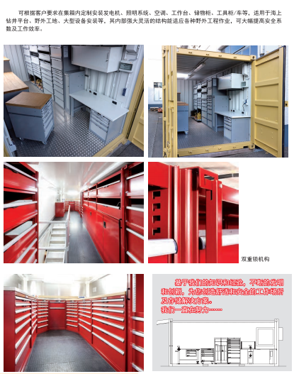 冠久可根據(jù)客戶要求在集裝箱內(nèi)定制安裝發(fā)電機,照明系統(tǒng),空調(diào),工作臺,儲物柜,工具柜,工具車,等,適用于海上鉆井平臺,野外工地,大型設(shè)備安裝等,其內(nèi)部強大靈活的結(jié)構(gòu)能適應(yīng)各種野外工程作業(yè),可大幅提高安全系數(shù),及工作效率。基于用戶的指示和我們的經(jīng)驗,不斷的發(fā)明和創(chuàng)新,為您創(chuàng)造舒適和安全的工作場所所及存儲的方案。冠久人一直在努力.......