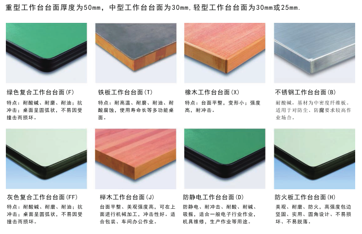 重型工作臺臺面厚度為50mm,中型工作臺臺面厚度為30mm,輕型工作臺臺面厚度為30mm或25mm,工作臺,各種臺面的特點:1,綠色復(fù)合工作臺臺面,特點:耐酸堿,耐磨,耐油,抗沖擊,桌面呈圓弧狀,不易因受撞擊而損壞。2,鐵板工作臺臺面,特點:耐高溫,耐磨,耐油,耐酸腐蝕,使用壽命長等多功能桌面。3,橡木工作臺臺面,特點:臺面平整,變形小,強度高,耐沖擊。4,不銹鋼工作臺臺面,特點:耐酸堿,基材為中密度纖維板。適用于防塵,防腐要求較高作業(yè)場合。5,灰色復(fù)合工作臺臺面,特點:耐酸堿,耐磨,耐油,抗沖擊,桌面呈圓弧狀,不易因受撞擊而損壞。6,櫸木工作臺臺面,特點:臺面平整,變形小,美觀強度高,可在上面進行機械加工,沖擊性好,適合包裝,車間辦公作業(yè)。7,防靜工作臺臺面,特點:防靜電。耐酸堿,抗沖擊,吸振,適用于電子行業(yè)作業(yè),機具維修,生產(chǎn)作業(yè)等用途。8,防火板工作臺臺面,特點:美觀,防火,耐磨,高強度包邊堅固,實用,圓角設(shè)計,不易損壞,不易脫落。*工具柜|工具車|工作臺|首選上海冠久021-69981259
